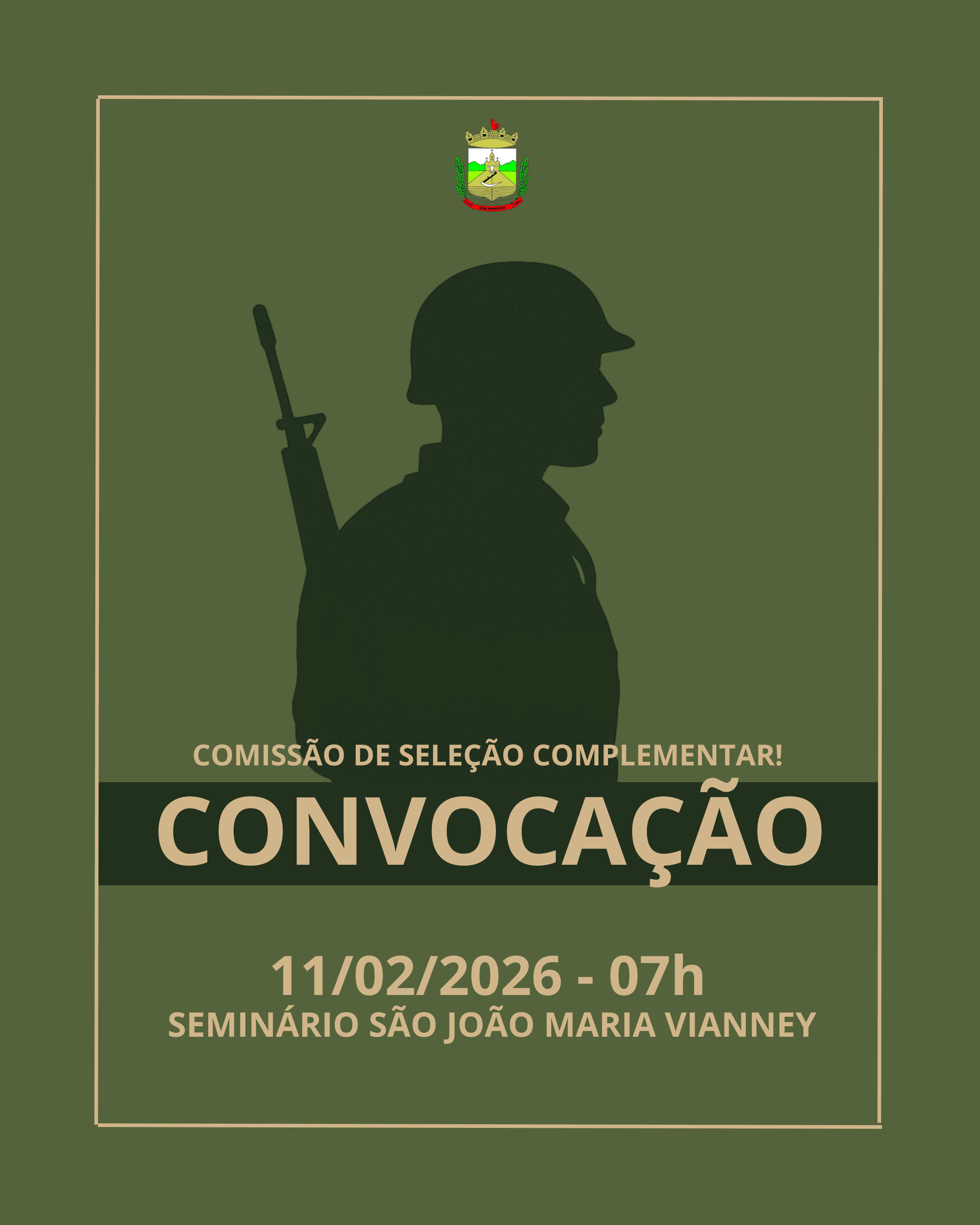 A convocação para a Comissão de Seleção Complementar acontece exclusivamente no dia 11 de fevereiro de 2025, com início às 7h, no Seminário São João Maria Vianney, em Bom Princípio. A Junta de Serviço Militar esclarece que a informação que consta no sistema de alistamento, indicando apresentação no dia 20 de janeiro, em São Gabriel, está incorreta. Portanto, os convocados não devem se apresentar em São Gabriel, devendo comparecer somente na data e no local informados nesta convocação oficial.