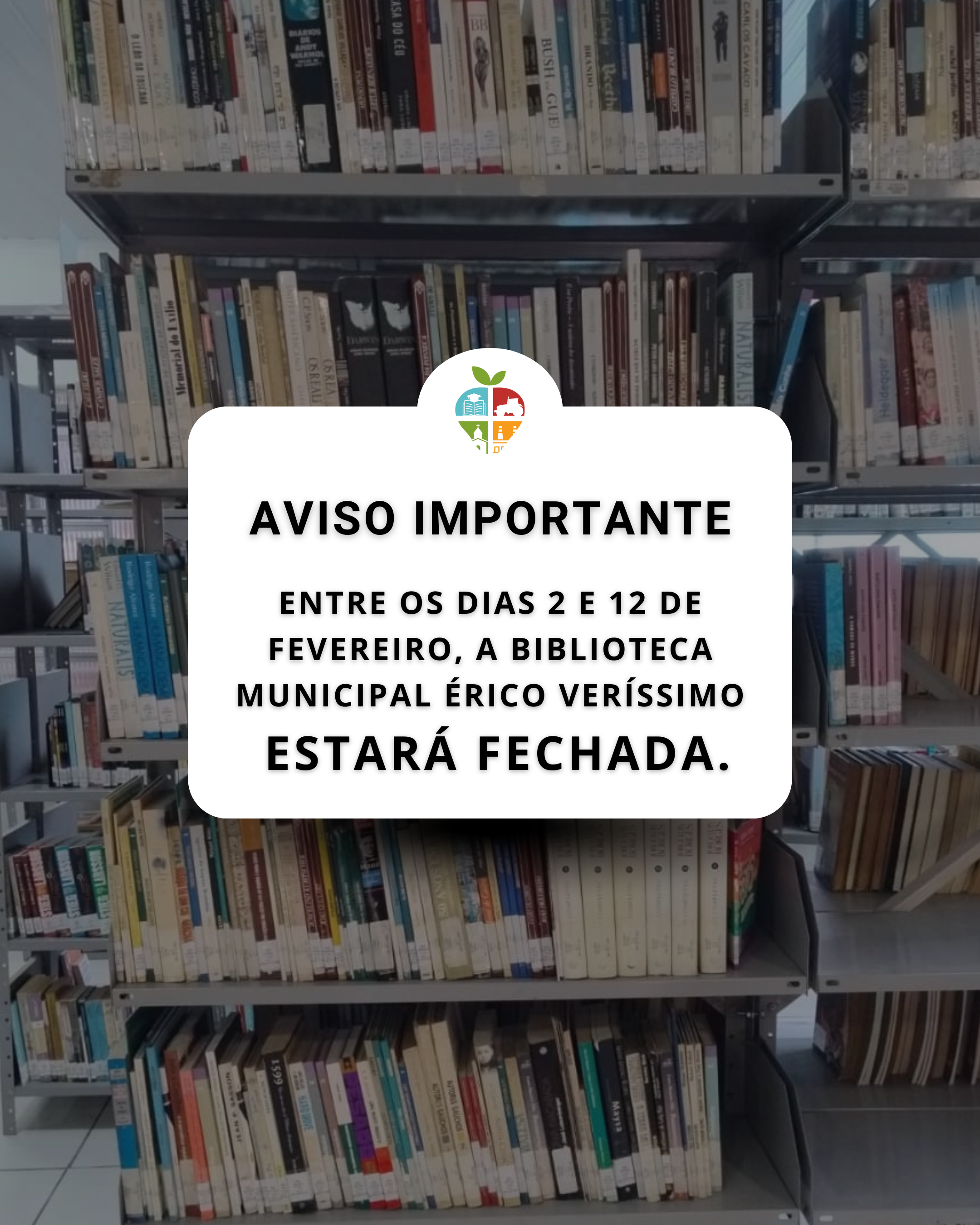 📚 A Biblioteca Municipal Érico Veríssimo estará fechada de 2 a 12 de fevereiro.