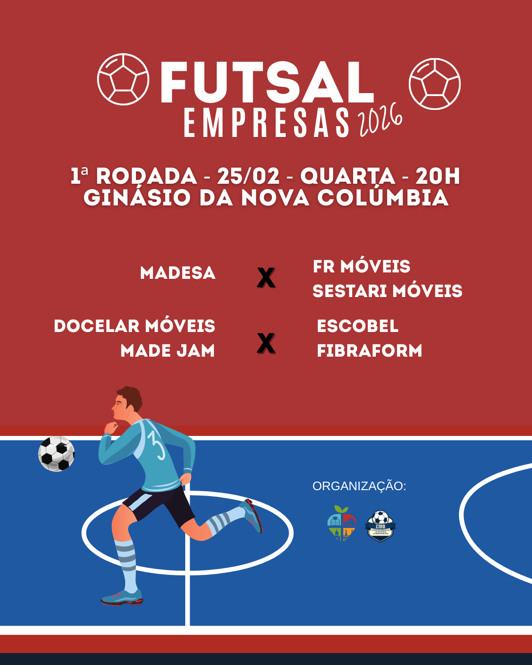 Está tudo pronto para o início do Campeonato de Empresas 2026. A competição volta a reunir equipes locais em um momento de integração, esporte e confraternização. E o ginásio da Nova Colúmbia será palco da estreia da competição. Com uma chave única, cinco equipes entram em quadra nesta temporada: Madesa, Escobel/Fibraform, Docelar Móveis/Made Jam, FR Móveis/Sestari Móveis e Super Ledur.
